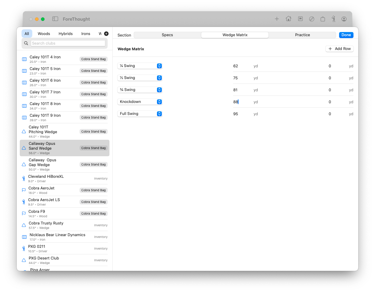 Club inventory with different bags (Gapping Chart and Wedge Matrix)