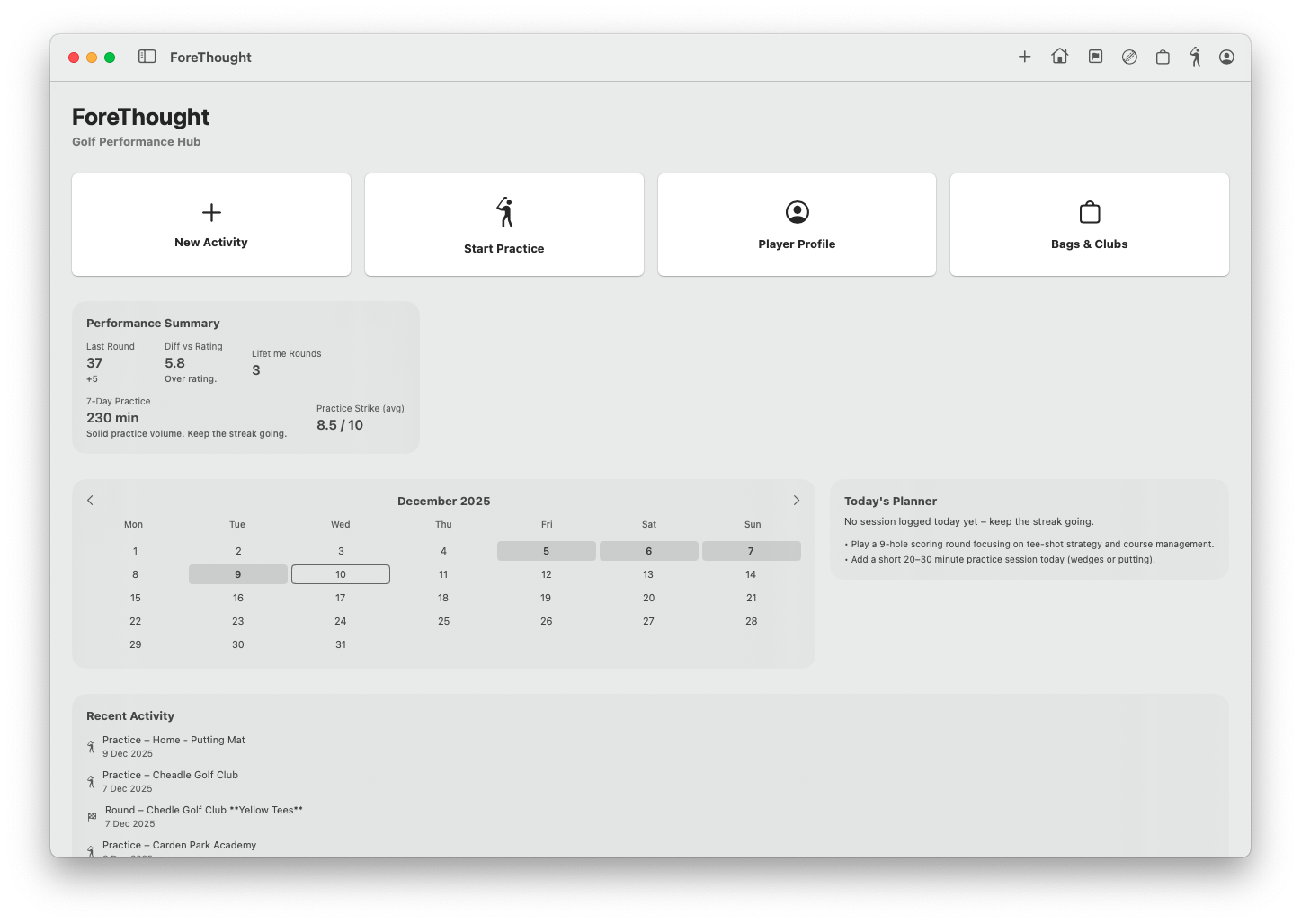 If you’ve found this page, you’ve either missed spelt something really badly or I've given you a link 🤣. So ForeThought my Golf Performance Hub app, built for MacOS 13 (Ventura) and newer, to give it a phrase a “retrospective golf data gathering tool” - for me the idea was to sit down away from my phone and input the data with a brew and a packet of biscuits.